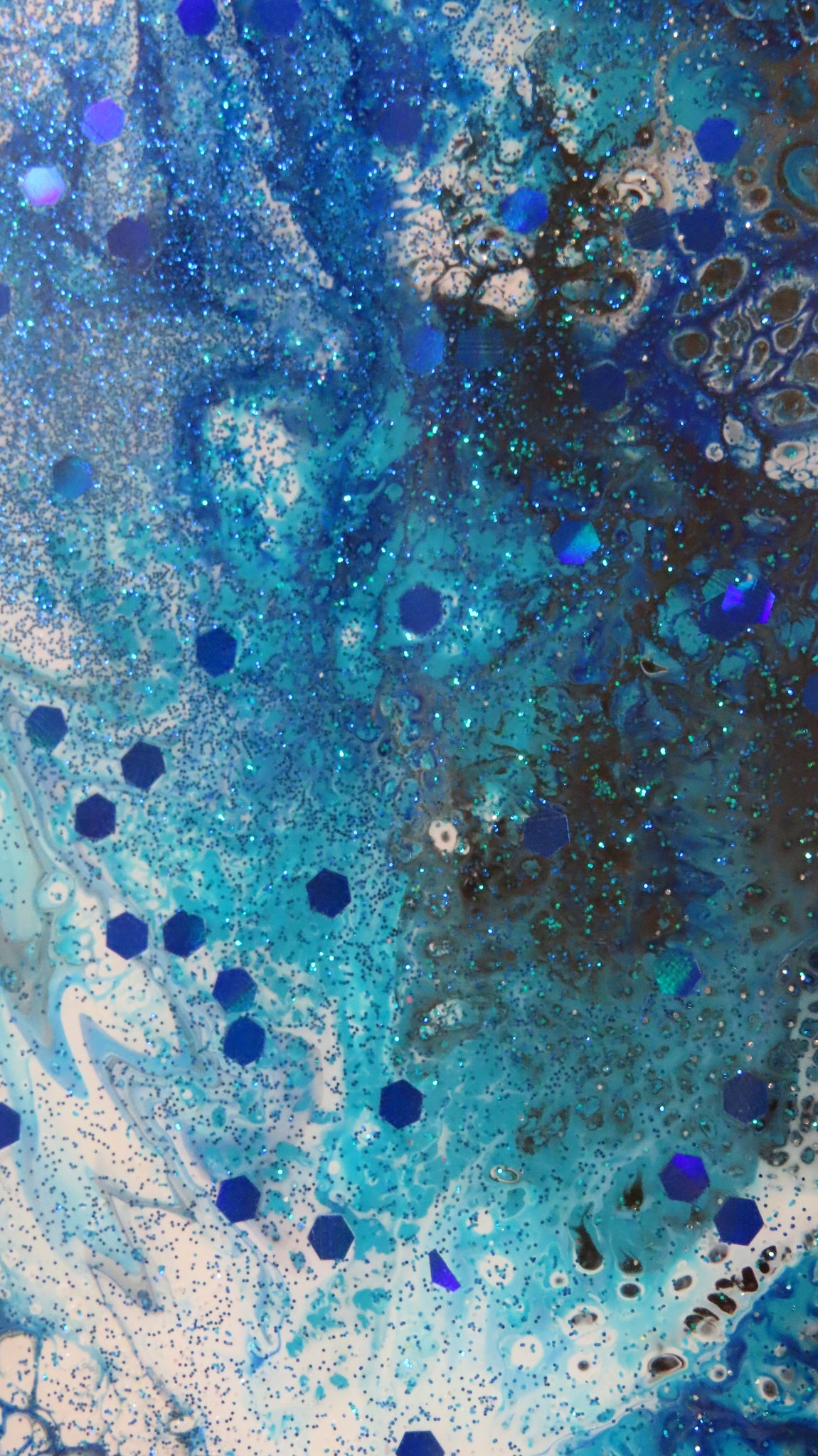 Acrylic blues, black and white paints and some glitters are flowing together in this abstract painting. Be mesmerized when this is hanging on a wall or when this is serving some Precut Cheese, Crackers, Finger Foods or Sushi upon it for your guests. Food safe resin top coat. (Do NOT CUT on a resin surface. NOT A CUTTING BOARD!)