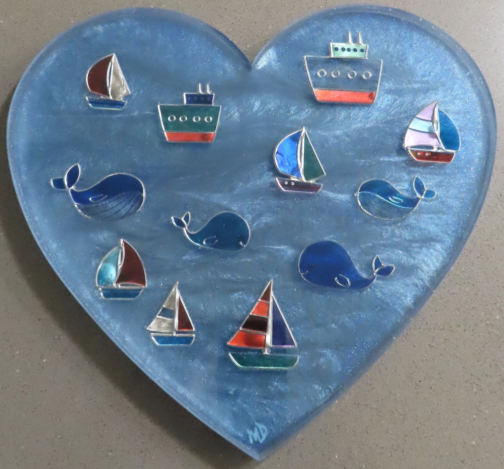 Resin is multi layers of resin. Blue resin waters with sailing boats and whales Size: 8.5" x 9.25"